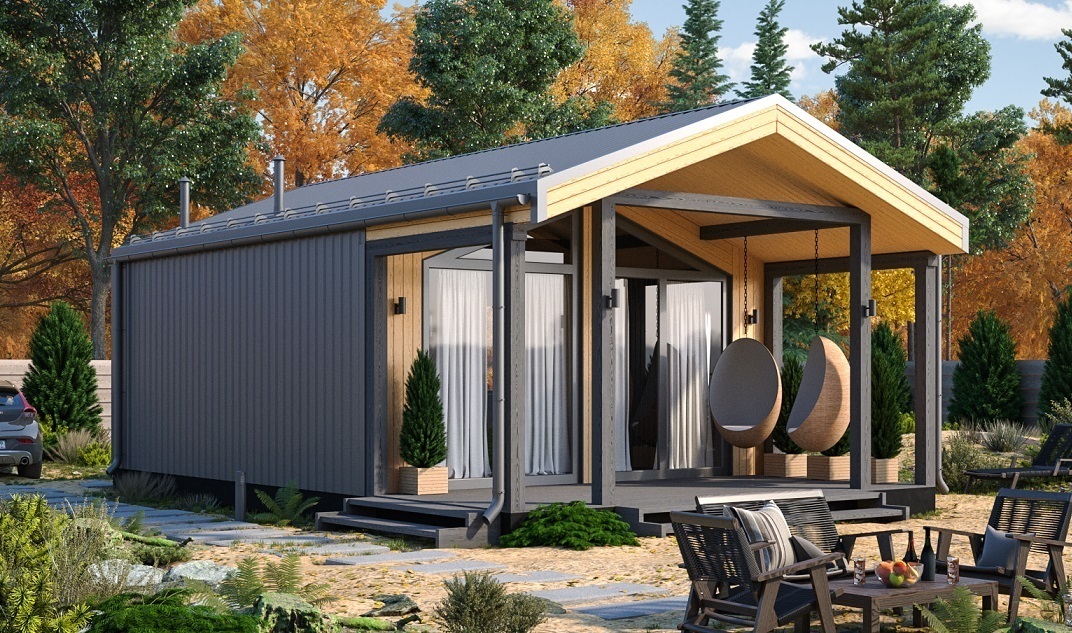 В доме есть одна небольшая спальня, полноценный санузел и светлая просторная кухня-гостиная с выходом на террасу